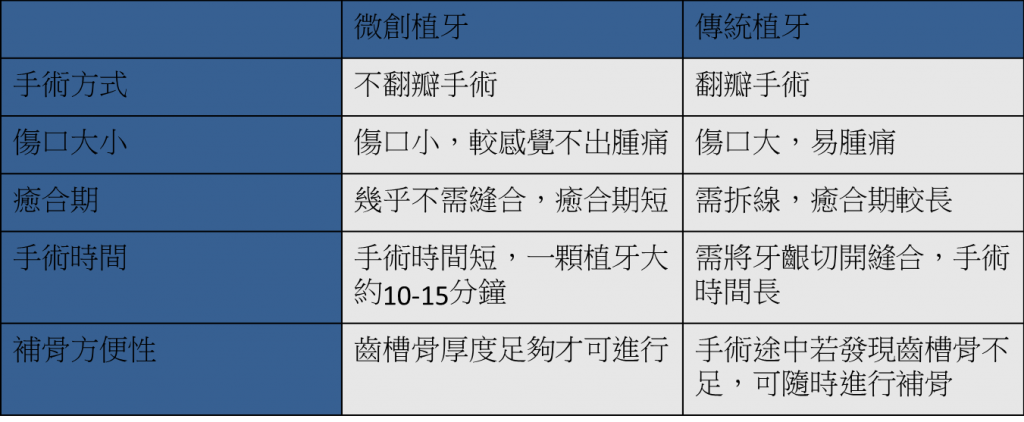 認識微創植牙 什麼是微創植牙?微創植牙顧名思義即為傷口很小的植牙手術,也稱為不翻瓣手術。微創植牙的手術方式是在牙肉與齒槽骨鑽孔,省去以往傳統植牙將牙齦翻開步驟,不需翻瓣直接將植體植入(如圖),只需要大概10-15分鐘即可完成植牙手術,術後因傷口小、幾乎不用縫合,相對起來較感覺不到傷口腫、痛情形,縮短癒合的時間。 微創植牙術前注意事項微創植牙雖然方便、快速,卻需要搭配嚴謹的術前評估,尤其需先治療好牙齒的其他症狀,如牙周病、蛀牙等,還給口腔一個健康的環境,以免植牙後造成細菌感染,影響植牙區傷口與骨整合情形,造成植牙失敗。超級比一比:微創植牙V.S.傳統植牙 比較起來,微創植牙看似較容易且術後癒合狀況佳,不過並不是人人都可以進行微創植牙的,還需經過醫師仔細的綜合口腔與身體狀況進行評估才可執行。 關於植牙費用 關於植牙壽命